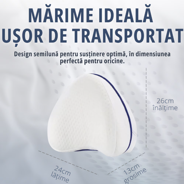 - Design Stabilitate Maximă: Spre deosebire de pernele obișnuite, aceasta include un design ergonomic conturat și o bandă elastică de fixare. Astfel, perna rămâne fixată perfect pe picior, indiferent de cât de mult te miști în timpul somnului.